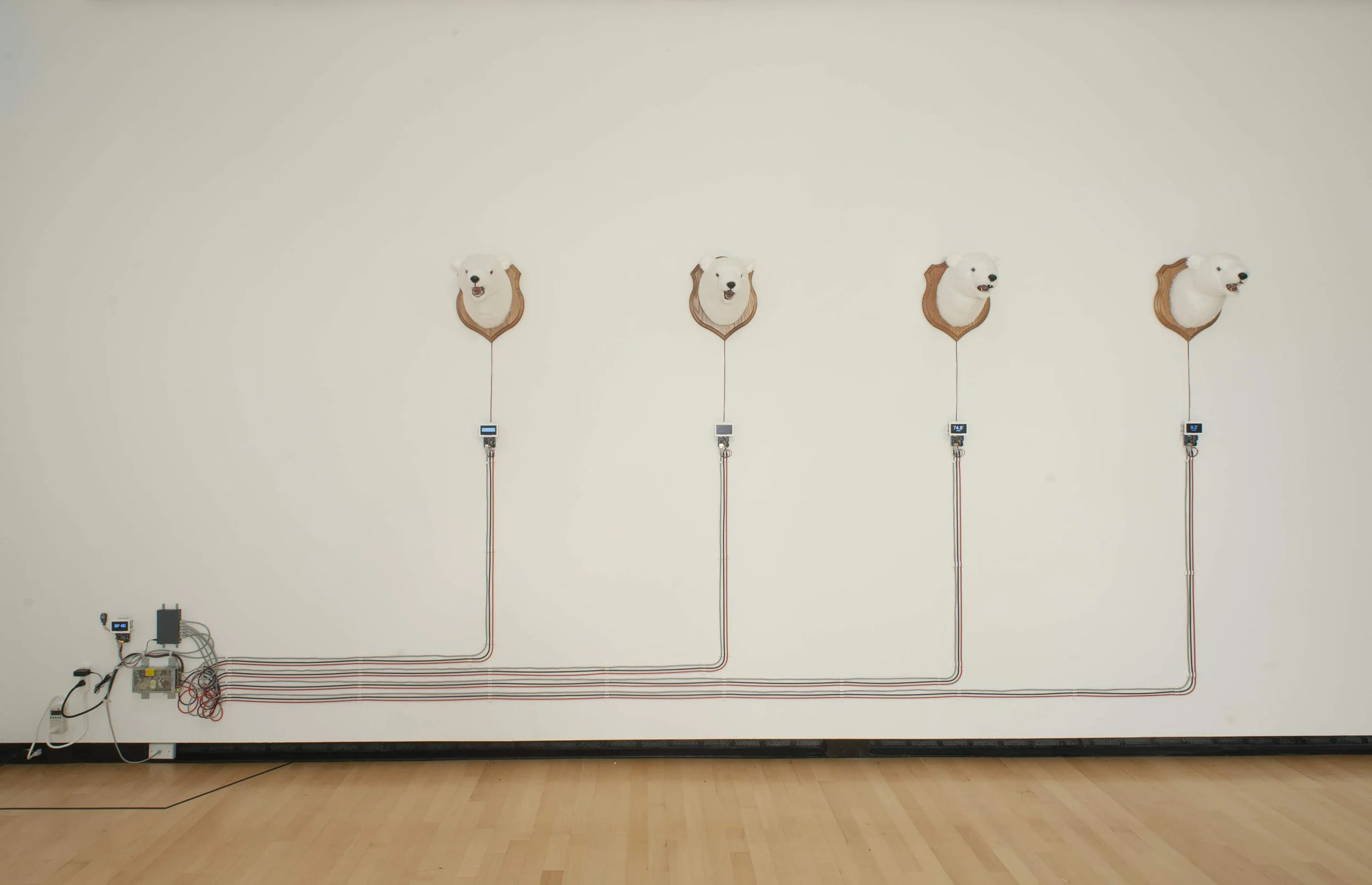 An ironic play on the classic coding exercise, “hello, world!,” Jason Livingston and Jason E Geistweidt use electronic circuitry with real-time data to show the difference between the current temperature and the 30-year average in the four cities the polar bears represent, each one a player in global debates on climate change. With eyes that glow redder with the rise in global temperatures, the installation turns what is often made invisible--the infrastructure behind our ever-increasing data consumption--into a visual signifier of the impact of this data use on our climate. Goodbye, World! reminds us of our collective impact on the ecosystem, and that even our well-meaning attempts at connection can end up being yet another method of extraction without regeneration.